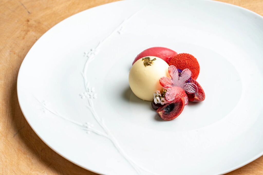The four-course tasting menu was a celebration of Devon’s finest seasonal produce. The seafood particularly sang here – perfectly cooked scallops and the sesame tuna were my personal highlights. Another unexpected delight was the local goat’s butter, drizzled with honey from the estate’s own beehives, which I’d passed earlier while strolling through the lavender-strewn grounds. The wine pairing menu added extra sparkle, with thoughtful selections from England, Japan, Australia and beyond. There are plenty of surprises woven throughout the evening – I won’t spoil them here – but it’s a meal to savour and remember.