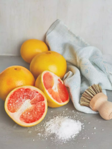 - Apply water to the cleaning surface (i.e. bath or sink) and start scrubbing with your salted grapefruit. You may need to pause every so often to add more salt to your fruit.